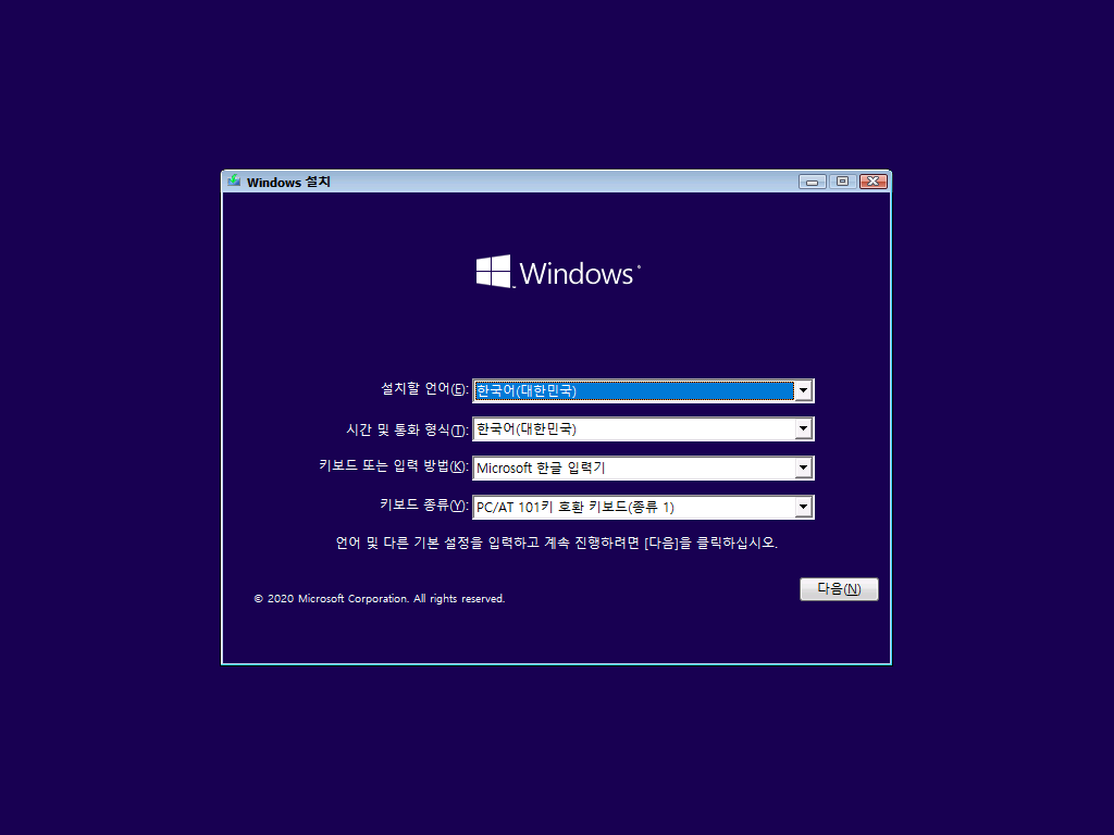 먼저 윈도우 10 ISO, DVD 또는 USB 등을 이용해 설치 화면으로 진입한다.