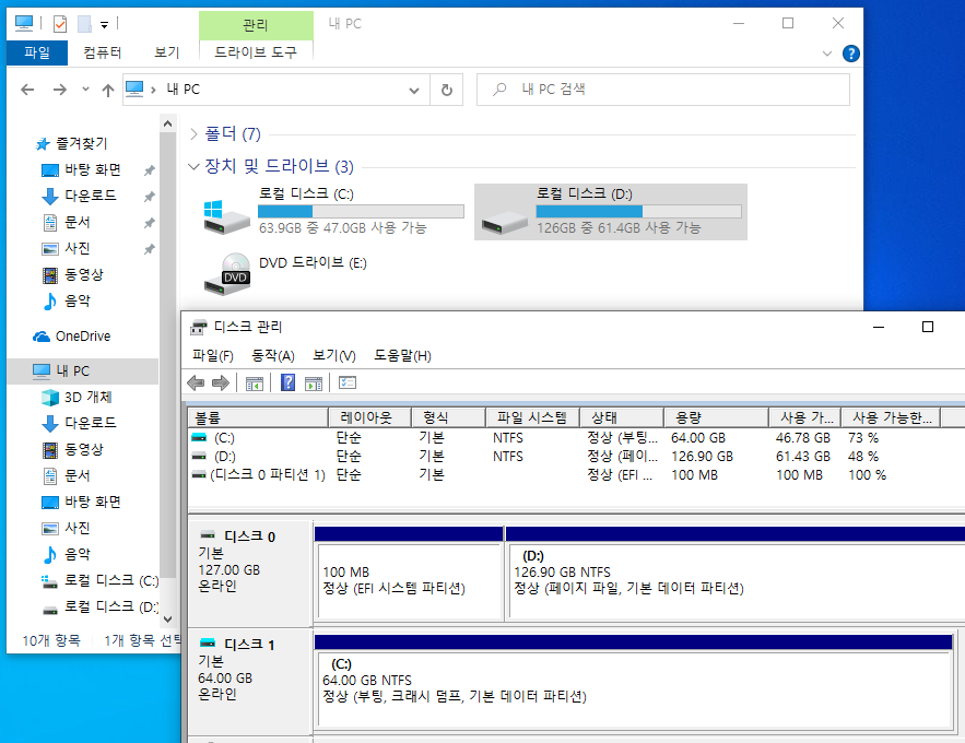 아래는 윈도우 10 설치 완료 후 디스크 관리자와 탐색기에서 확인한 모습이다.
