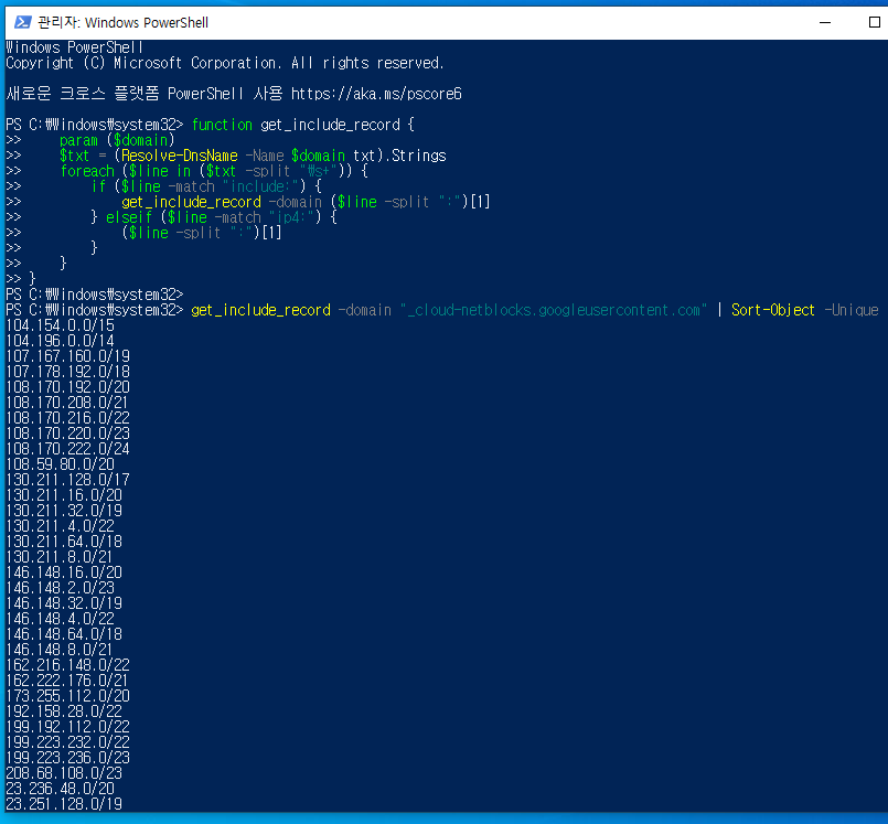 예전에 GCP Compute Engine IP 주소 범위 알아내려고 bash 스크립트 짰던 게 있는데 PowerShell 버전으로 다시 표현해 보았다. 사실 GCP의 경우 지금은 아래 API를 제공하고 있어서 불필요하긴 한데...