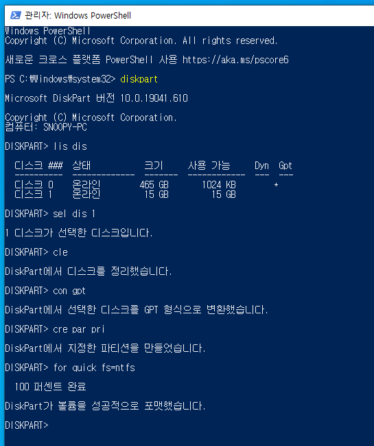 아래는 Diskpart로 16GB USB 스틱을 초기화, GPT로 변환, NTFS로 포맷하는 과정이다.